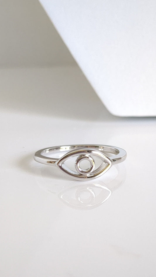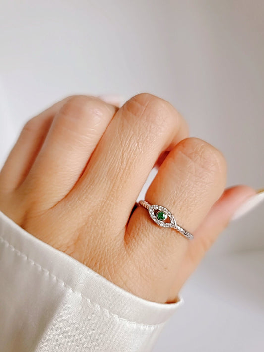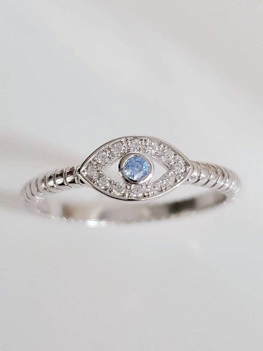 Sterling Silver Evil Eye Aquamarine Ring – Rhodium Plated, CZ Accents, Size 7