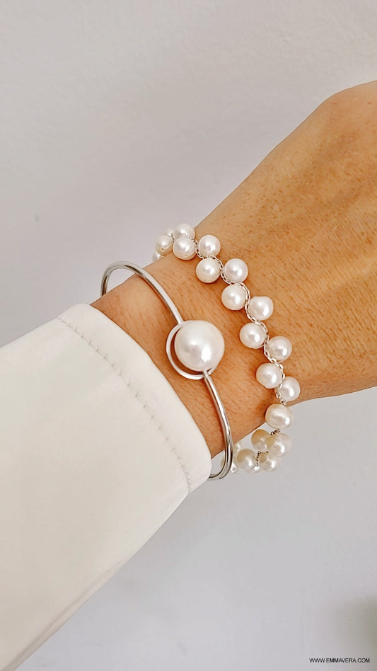 Sterling Silver Fresh Water Pearl Halo Bangle, Dainty Pearl Bracelet, 925 Sterling Silver Bangle, Women Bangle Bracelet