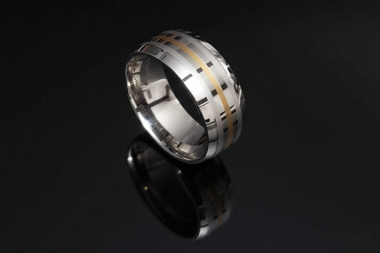 Gold Stripe, Silver, Black Stainless Ring, 8mm Band,