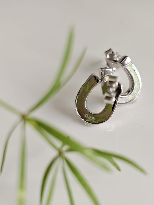 Sterling Silver Horseshoe Stud Earrings: White Lab Opal Lucky Charms