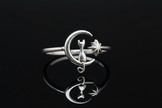 Cat on Moon Ring White Lab Opal or Plain Silver– Dainty Sterling Silver 925, Adjustable Thin Band, Cat & North Star Jewelry, Boho Gift