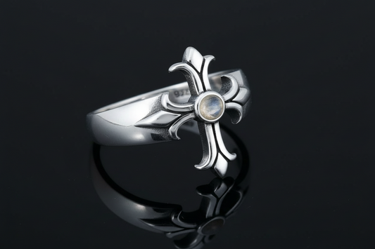 Sterling Silver Moonstone Eye Cross Ring: Medieval Gothic Jewelry