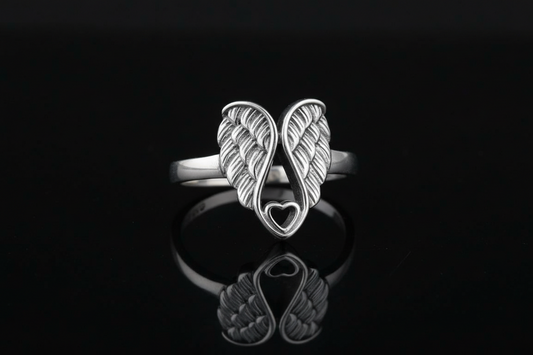 Sterling Silver Wings Ring: Heart Detail, Rhodium Plated