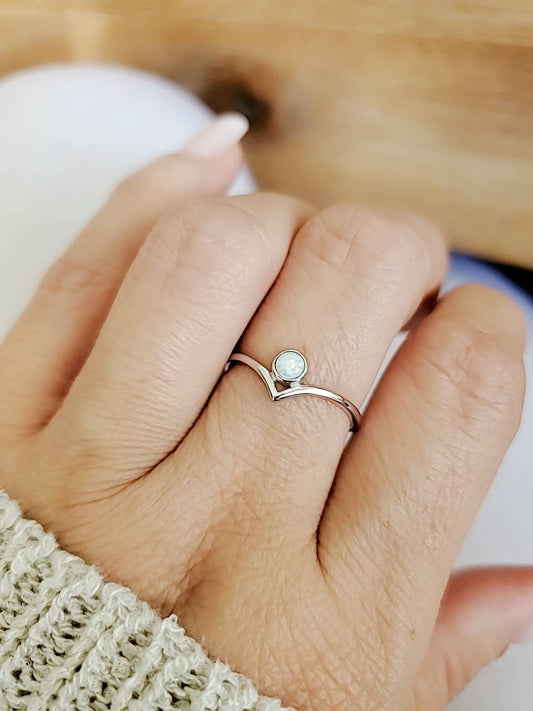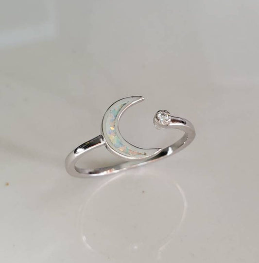 Sterling Silver Crescent Moon and Star Ring, White Opal Ring, Women's Stack Ring, White Opal Minimalist Ring, 925 Ring