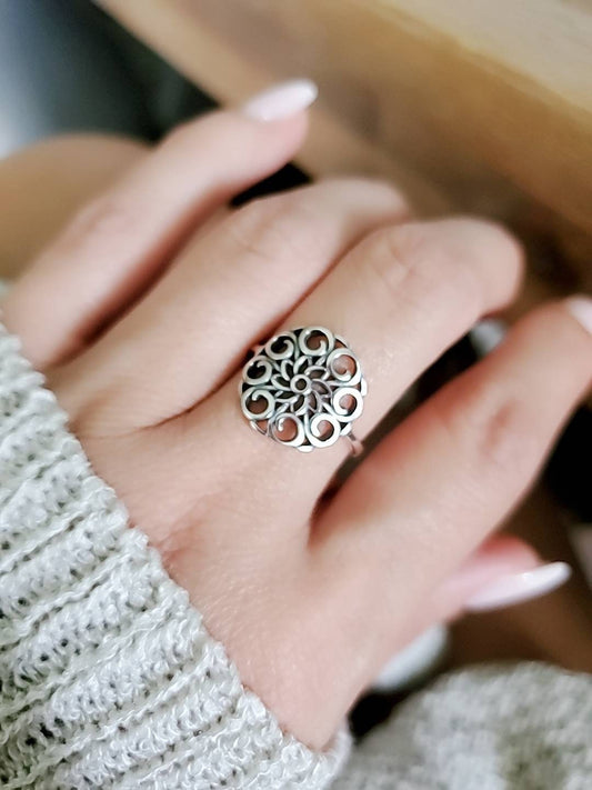 Sterling Silver Mandala Ring, Boho Chic Jewelry, Minimalist Ring, Bohemian Ring, Dainty Women's Ring, Statement Band, Size 5-12