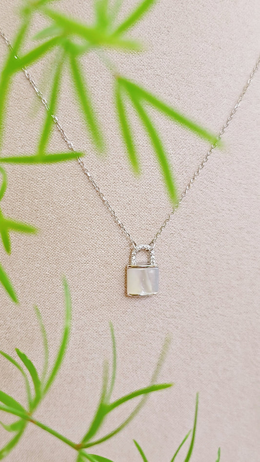 Sterling Silver Mother of Pearl Lock Pendant, Dainty Stack Necklace, Dainty Lock Charm, Layering Lock Pendant with Chain