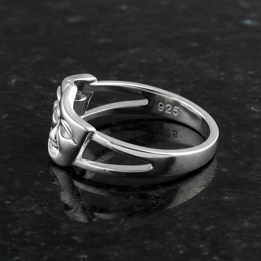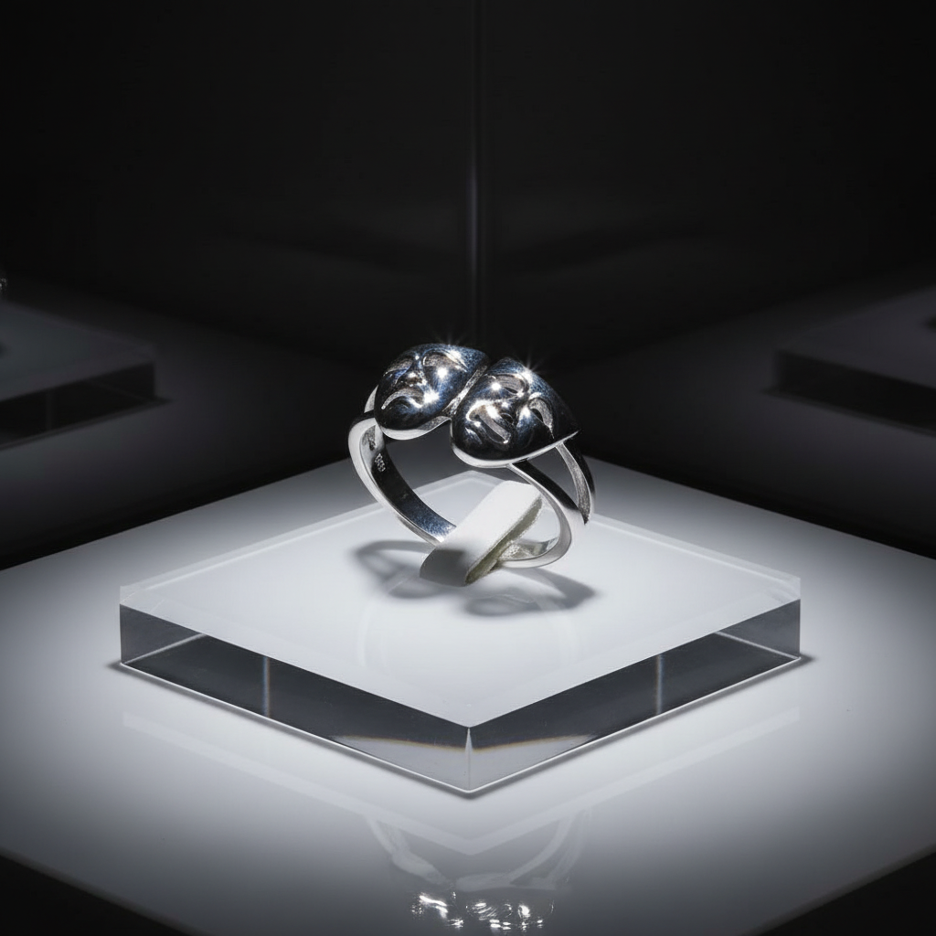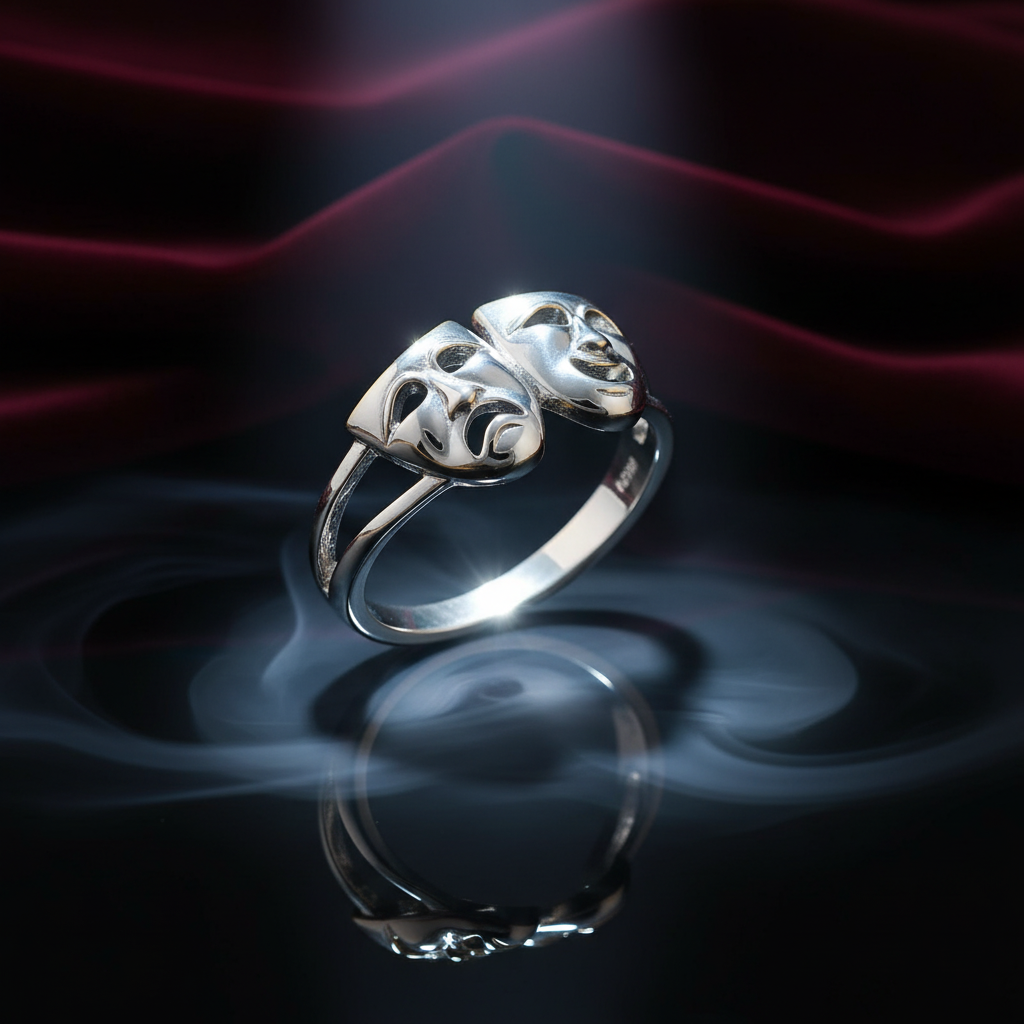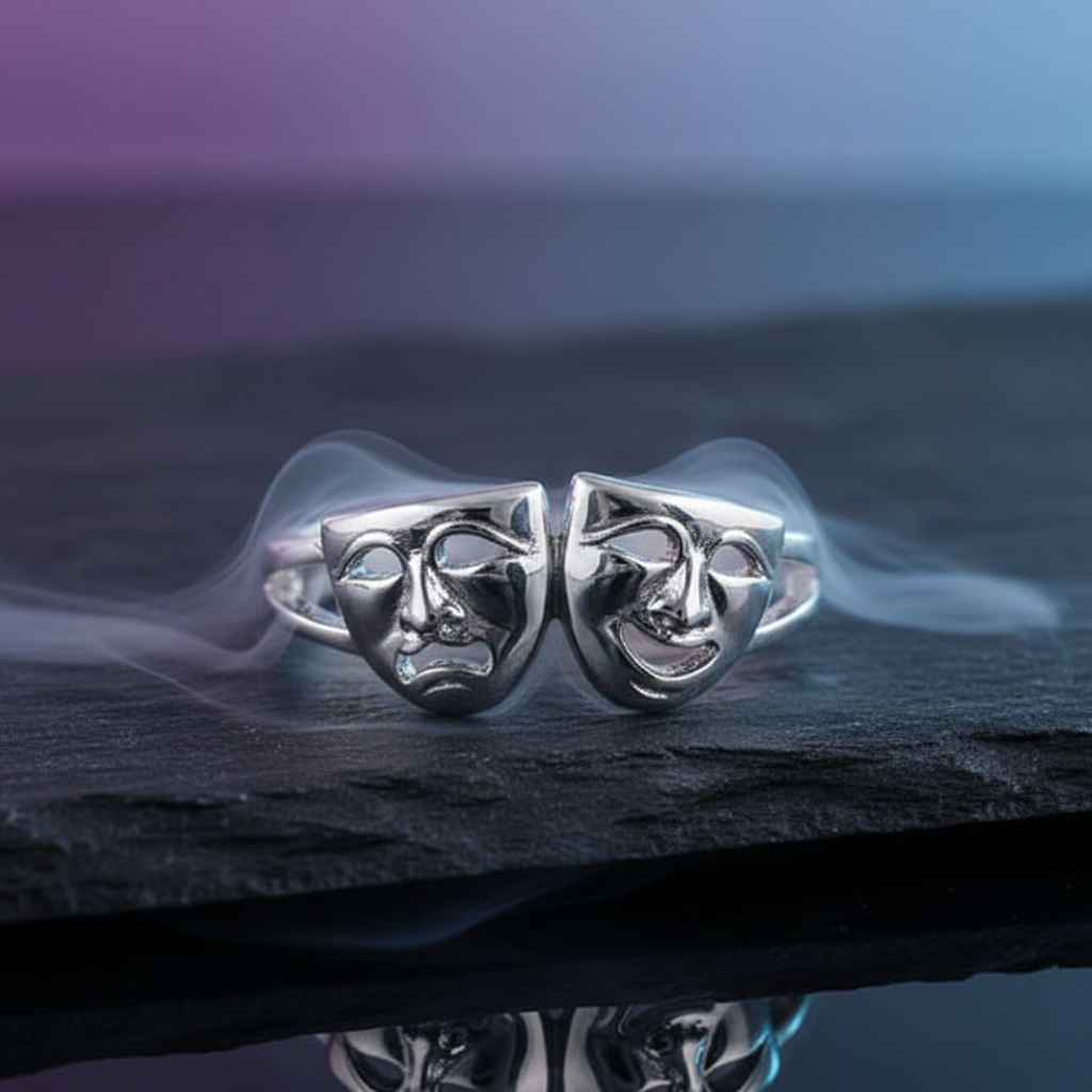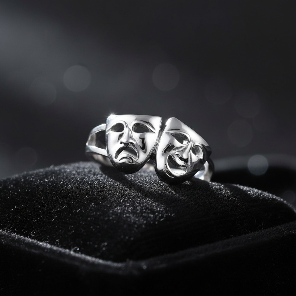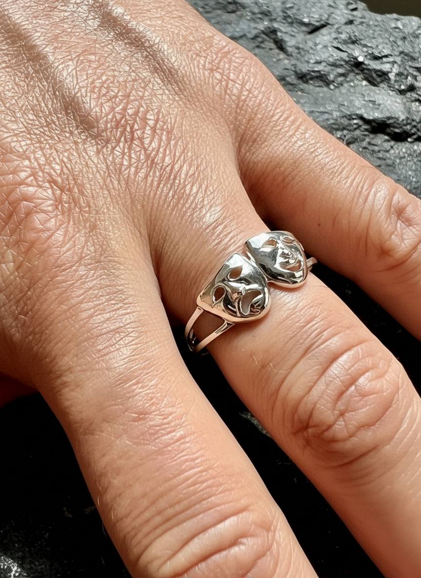 Introducing our Two-Face Ring: a Sterling Silver Theater Mask Ring featuring Happy and Sad faces. These non-tarnish rings are stamped with 925 for authenticity. One of the most popular Face-off rings on our site. Don't miss this opportunity to get this beautiful piece. They won't last! Top of ring height: 10.1mm Top of ring width: 16.6mm Band width: 4.3mm Shank width: 2.7mm Metal: 925 sterling silver Plating: rhodium plated Finish: high polish