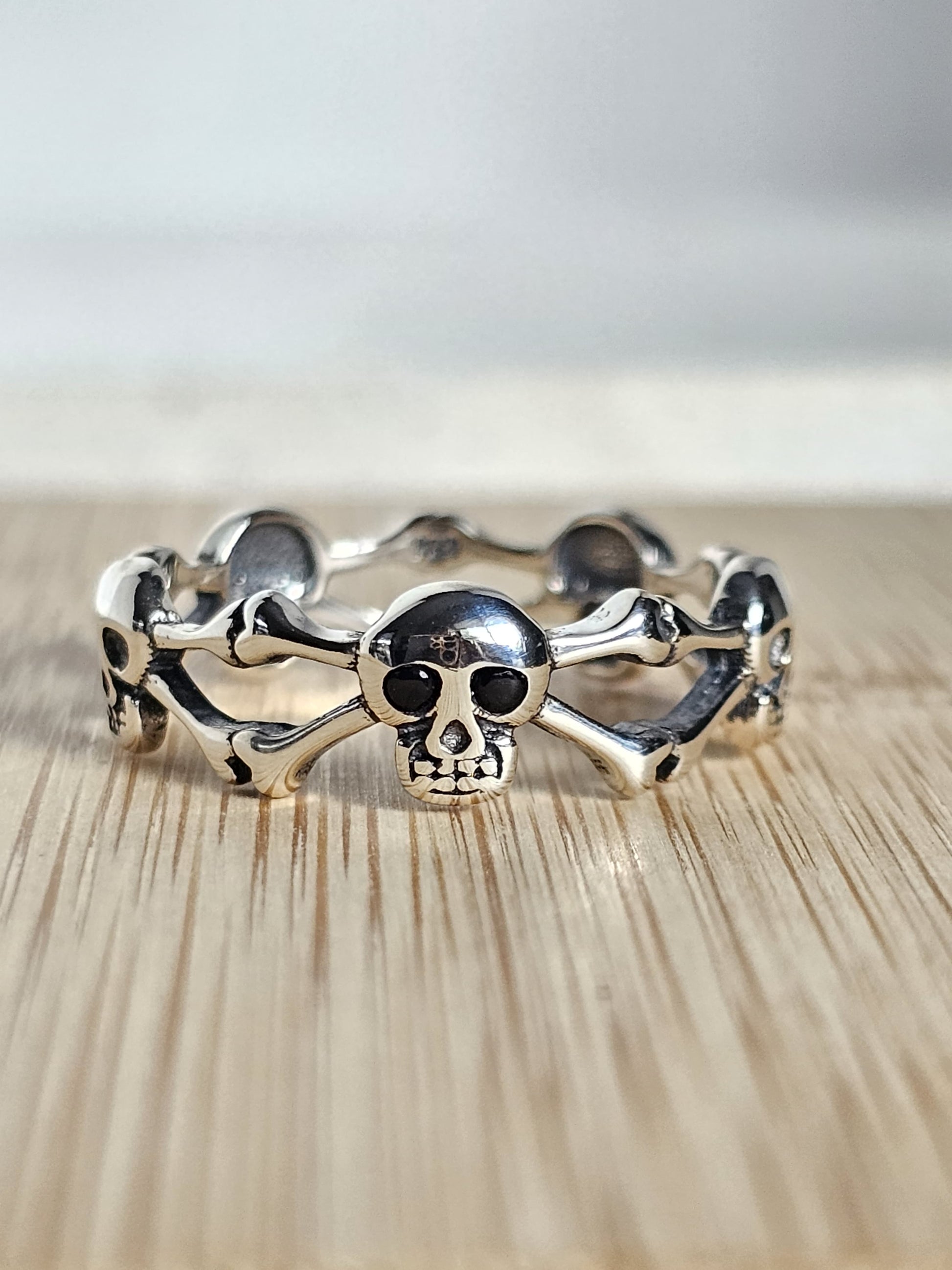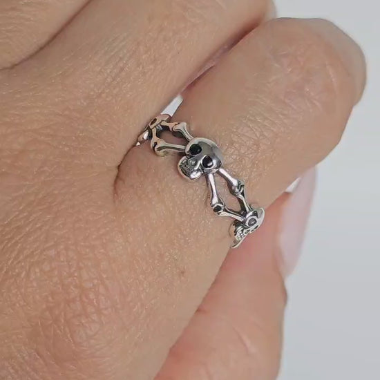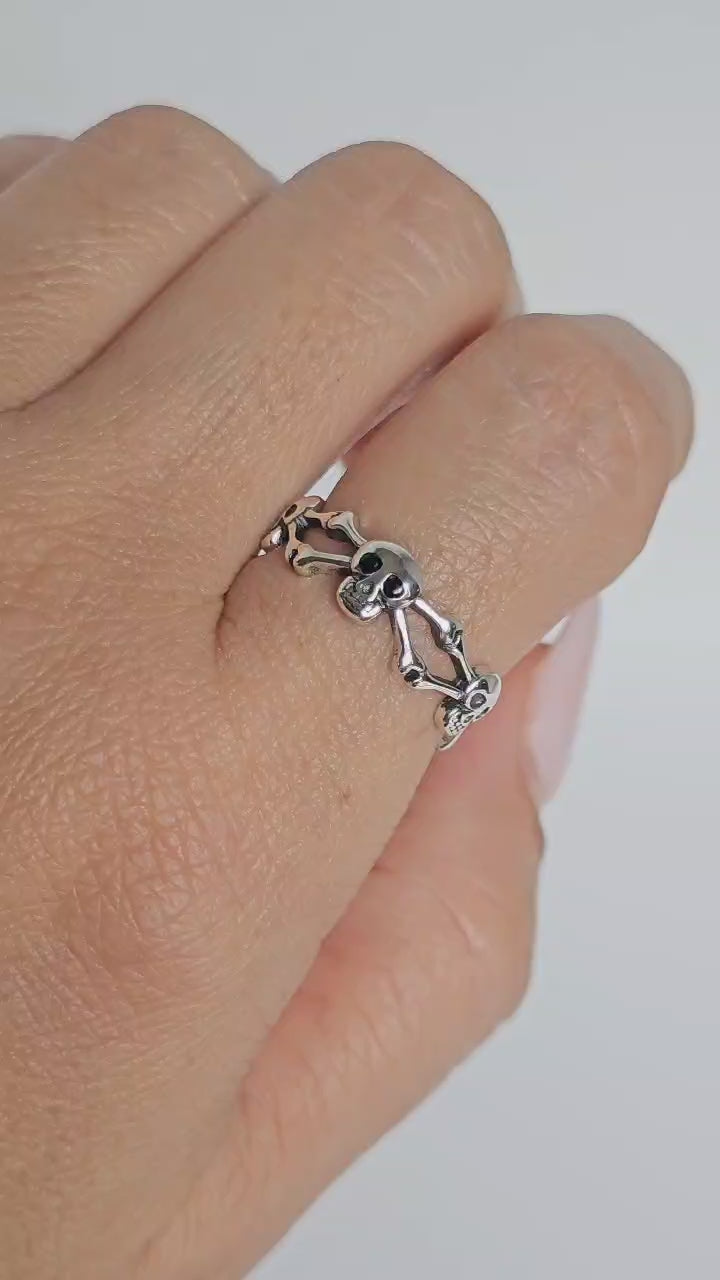 Sterling Silver Skull and Crossbones Ring – Gothic Eternity Band, Unisex, Oxidized Finish, Halloween Jewelry