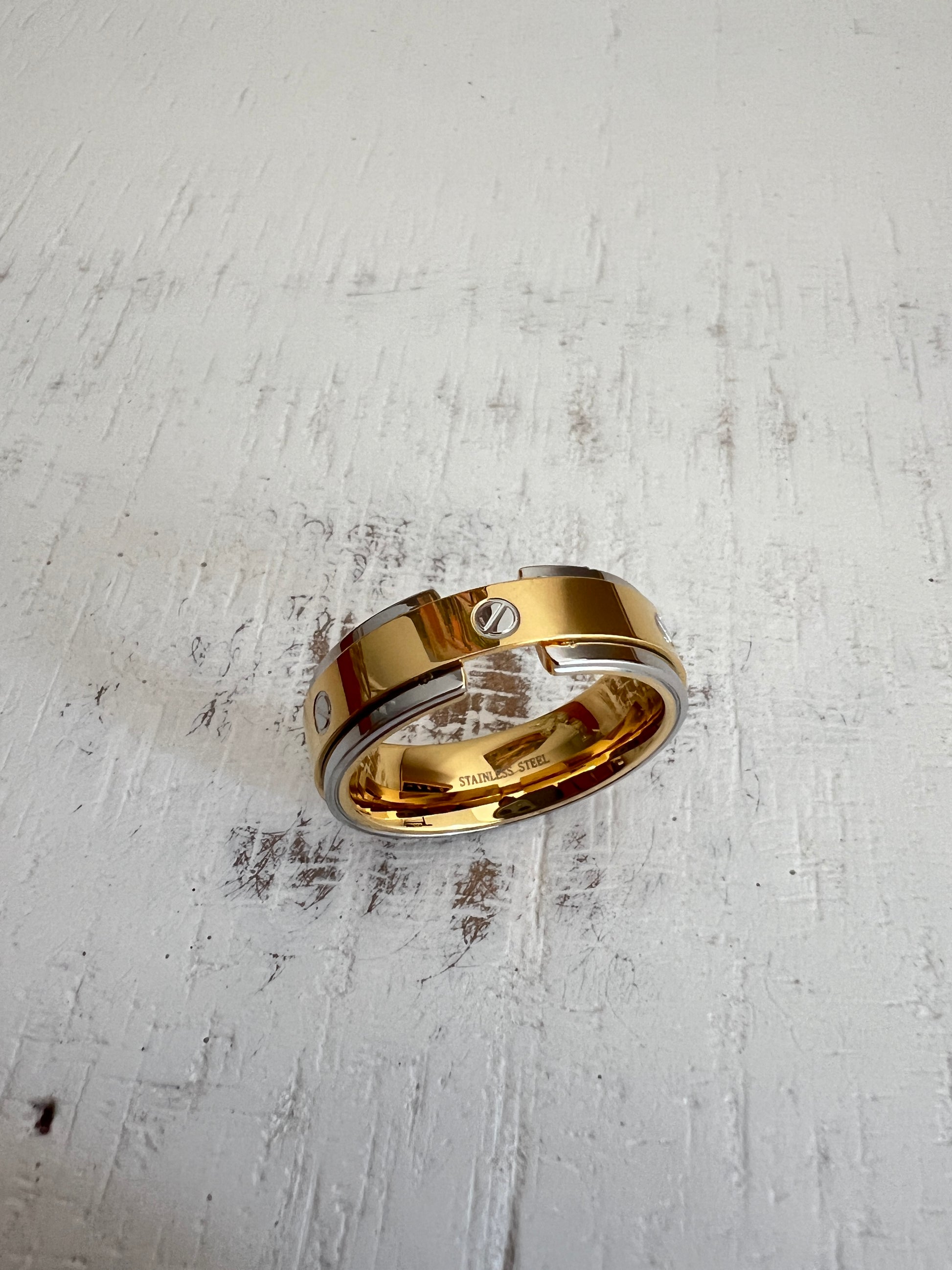 Grab this striking 8mm flat head band ring before it's gone forever! Featuring a contrasting gold/silver stainless steel design with mirror-like high polish finish, this statement piece is perfect for the fashion-forward individual who loves edgy, contemporary jewelry.